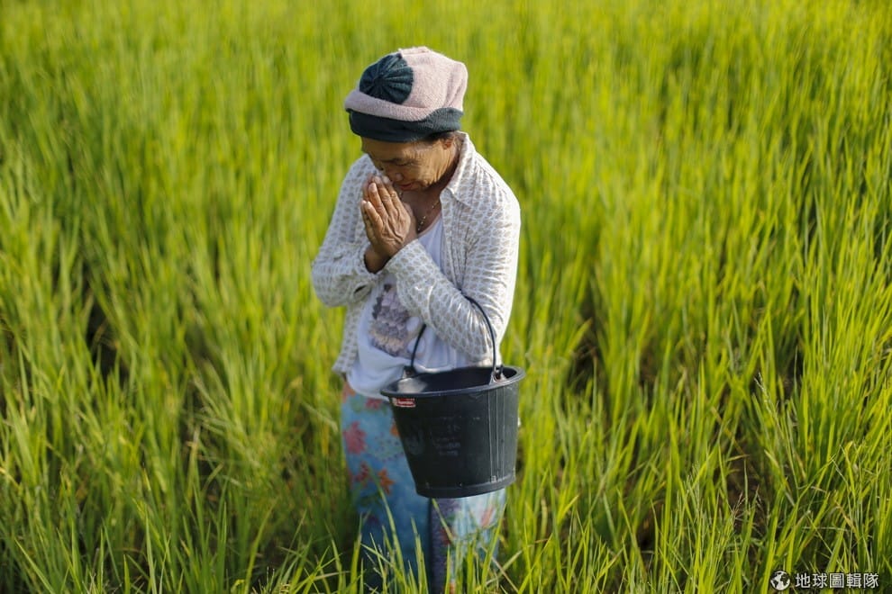 一名泰國女子在綠油油的稻田間雙手合十祈禱。泰國政府國長期補貼農人出口稻米,已經對國庫造成負擔。