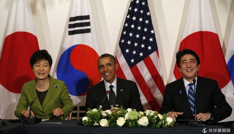 美國對日韓新協議樂觀其成。圖為去年 3月時,美日韓領導人在核子安全高峰會上留影。由左至右分別是南韓總統朴槿惠、美國總統歐巴馬和日本首相安倍晉三。