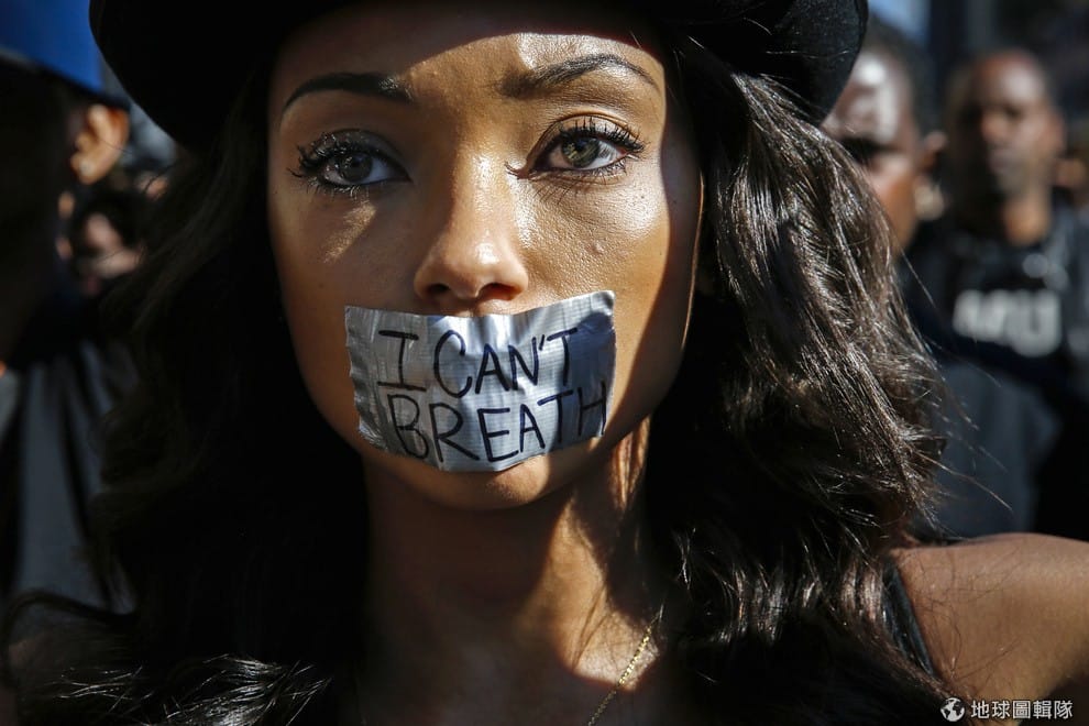 接連好幾起的美警槍殺黑人事件,再次挑起美國種族問題。一名女子用寫著「我不能呼吸」的膠帶封住嘴,抗議警方執法過當。