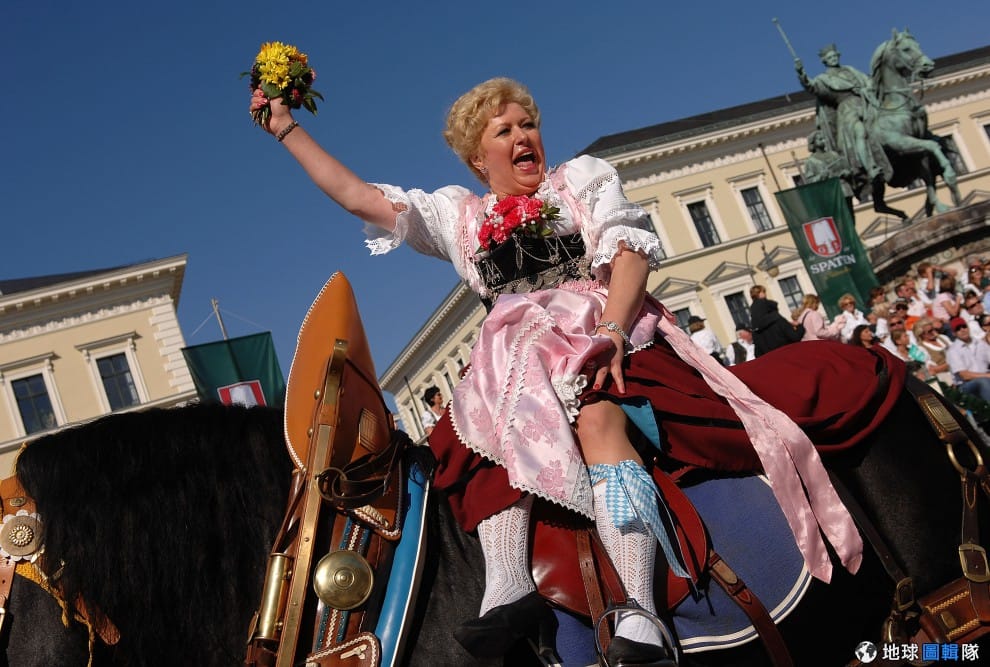 穿著傳統服裝的女性,正騎馬隨遊行隊伍前進,她開心的高舉手上的花束跟人群招手。圖片來源:Guenter Vahlkampf/Getty Images
