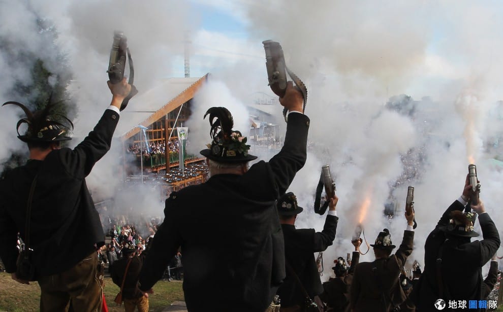 已經有200多年歷史的德國啤酒節,最早起源於1810年,當時為了慶祝路德威國王一世(King Ludwig I)的婚禮而開始了這項活動,而歷經世界大戰、疫病的這項活動也曾前前後後停辦了20多次。照片中來福槍表演者正在當地有名的「巴伐利亞」雕像前鳴槍。圖片來源:Alexandra Beier/Getty Images