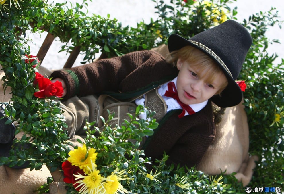 穿著傳統服飾的小男生,坐在花車裡面。圖片來源:Johannes Simon/Getty Images