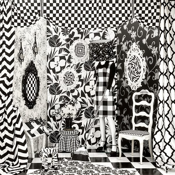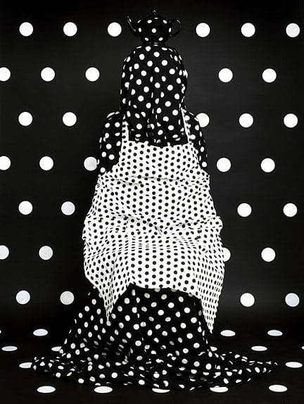 穿著黑點白底圍裙的女人靜靜地坐在白點黑底的布景前。