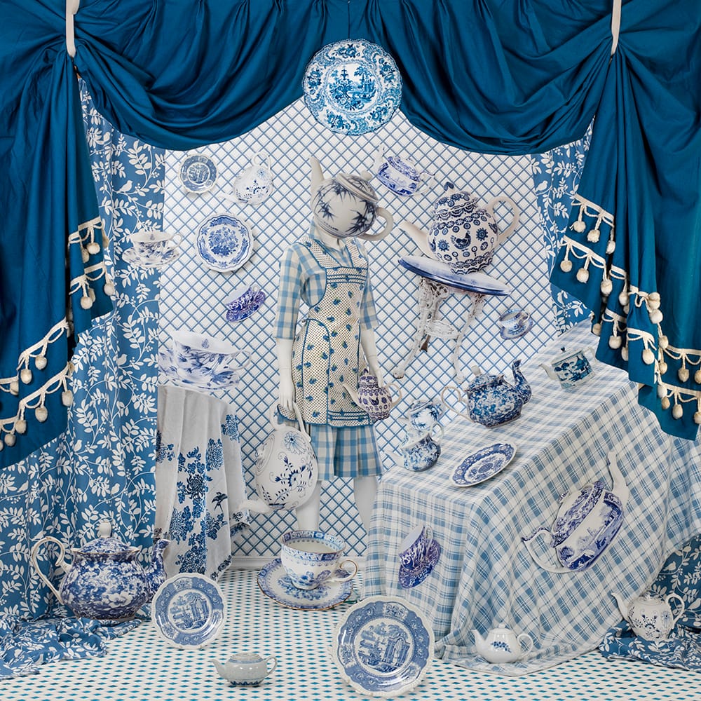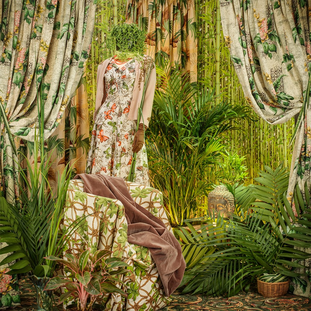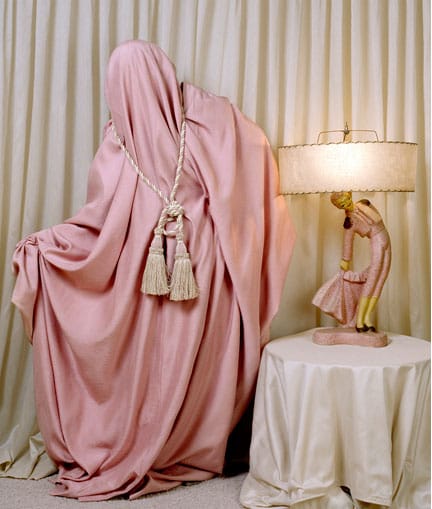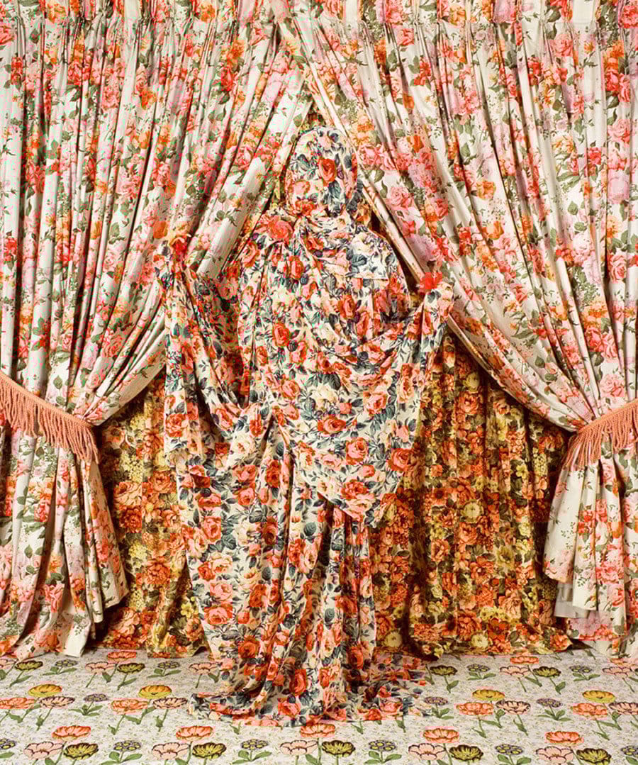 一塊塊色彩斑斕的布料,從頭到腳垂掛在牆壁上,待你走近一看才會發現這一塊塊花布中躲著個女人,這就是美國攝影師卡蘿(Patty Carroll)的〈沒有名字的女人〉(Anonymous Women)系列作品。卡蘿挑選的每一塊布料背後都代表女性被制約在傳統的性別角色中。過去,女人的責任就是挑選家中的地毯、布簾還有打造一個完美的家,對女人來說她們彷彿沒有名字,她們挑選的窗簾和布料的花樣取代了她們身為「人」的角色。