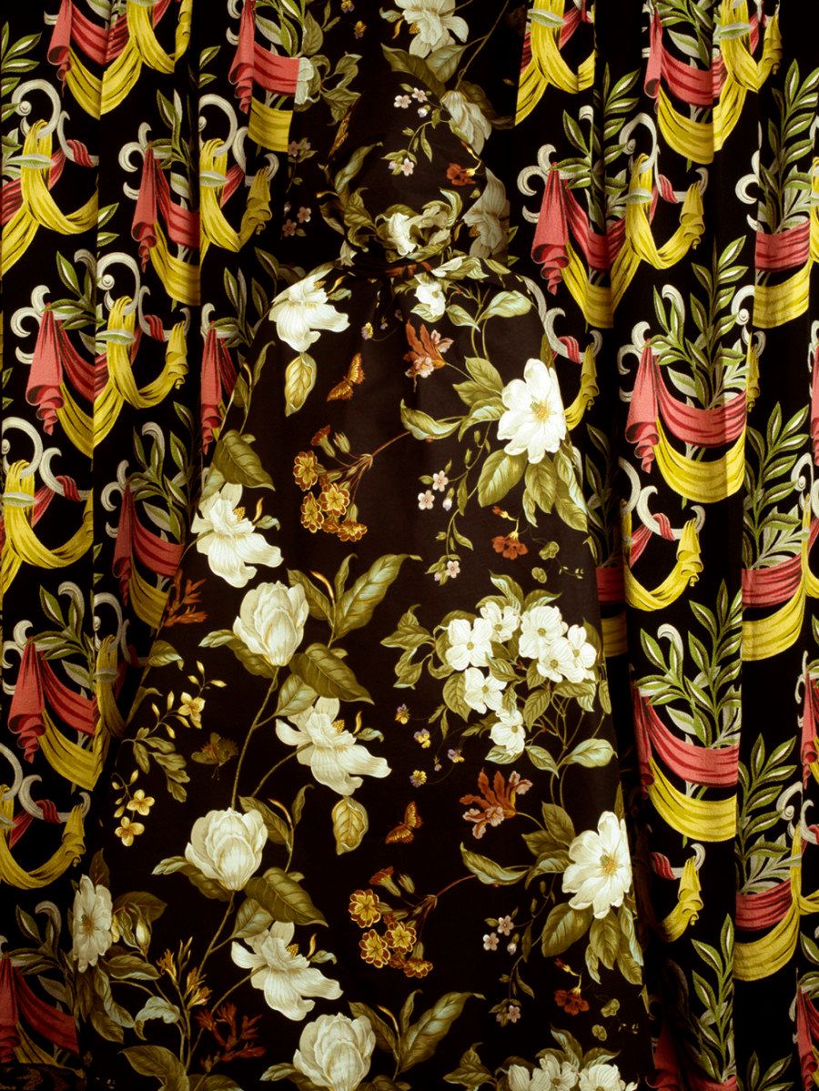 大朵大朵的花開在暗色系的布簾上,對於被限制在性別框架下的女性來說,布置家裡成了她們的責任和價值。