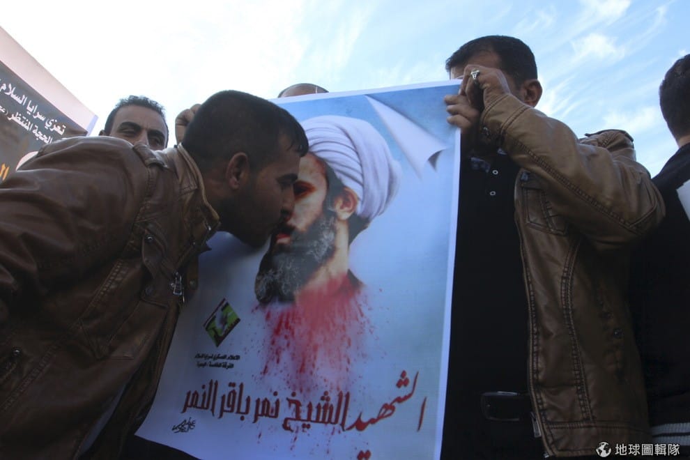 一名伊拉克什葉派穆斯林親吻被沙國處死的教士尼姆的畫像。尼姆之死讓沙國和伊朗斷交,中東各國也紛紛選邊站。