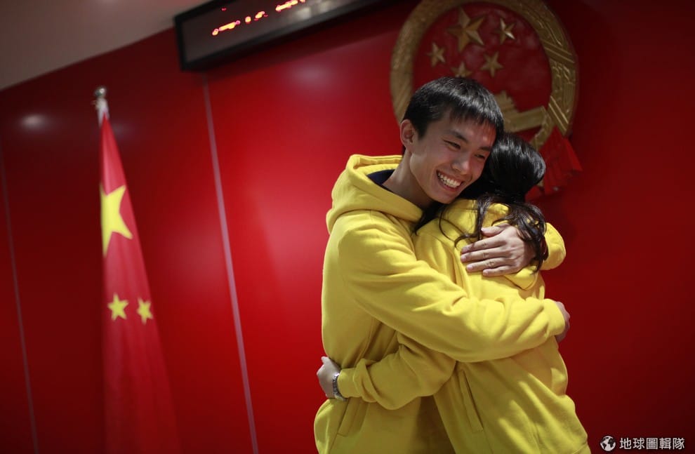 順利登記成婚的情侶穿著一樣的黃色運動服,開心地擁抱對方。