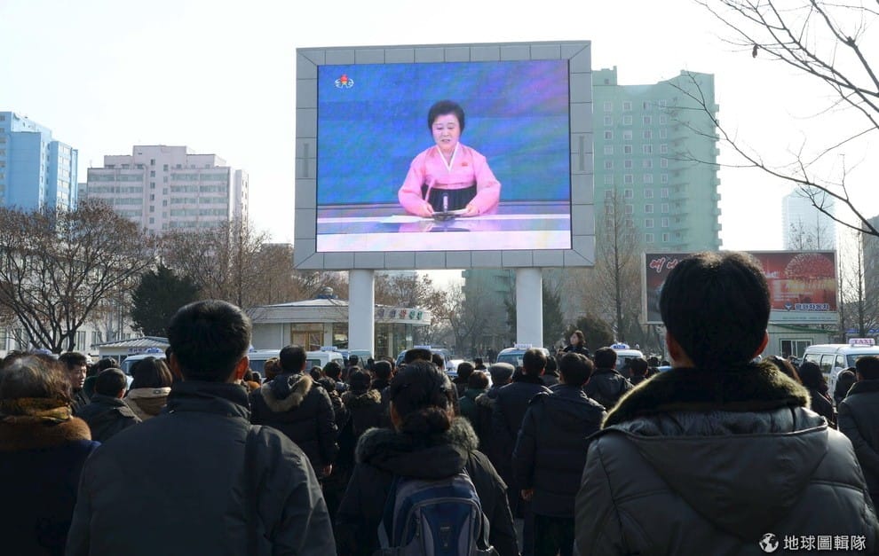 路透社平壤當地的大型螢幕,正在播報北韓政府試爆氫彈的新聞。
