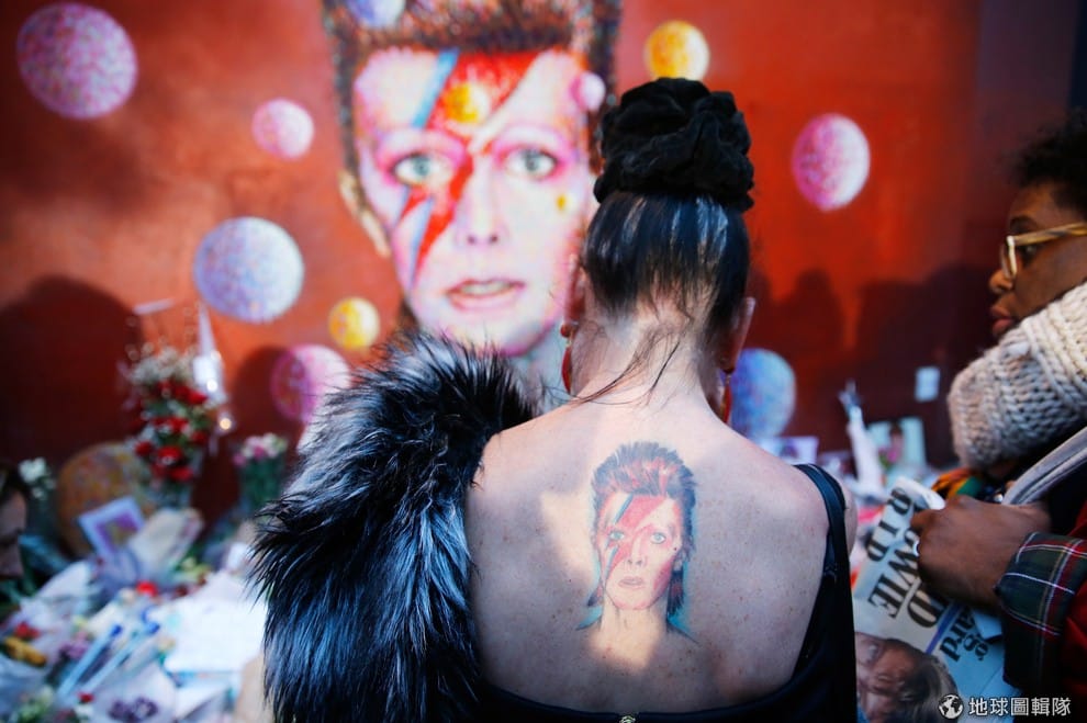 大衛鮑伊的粉絲在背後刺上他的經典造型,來到擺滿花圈的紀念壁畫前哀悼大衛鮑伊的過世。