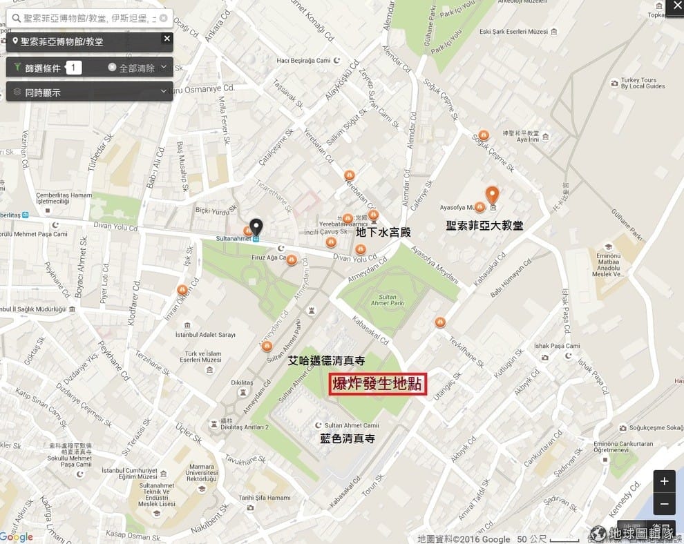路透社發生自殺炸彈攻擊的艾哈邁德廣場有許多觀光景點,知名的地下水宮殿、藍色清真寺以及聖索菲亞教堂都在附近。