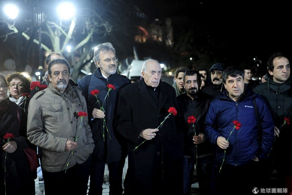 路透社土耳其醫療局成員拿著康乃馨到事件現場獻花致哀。