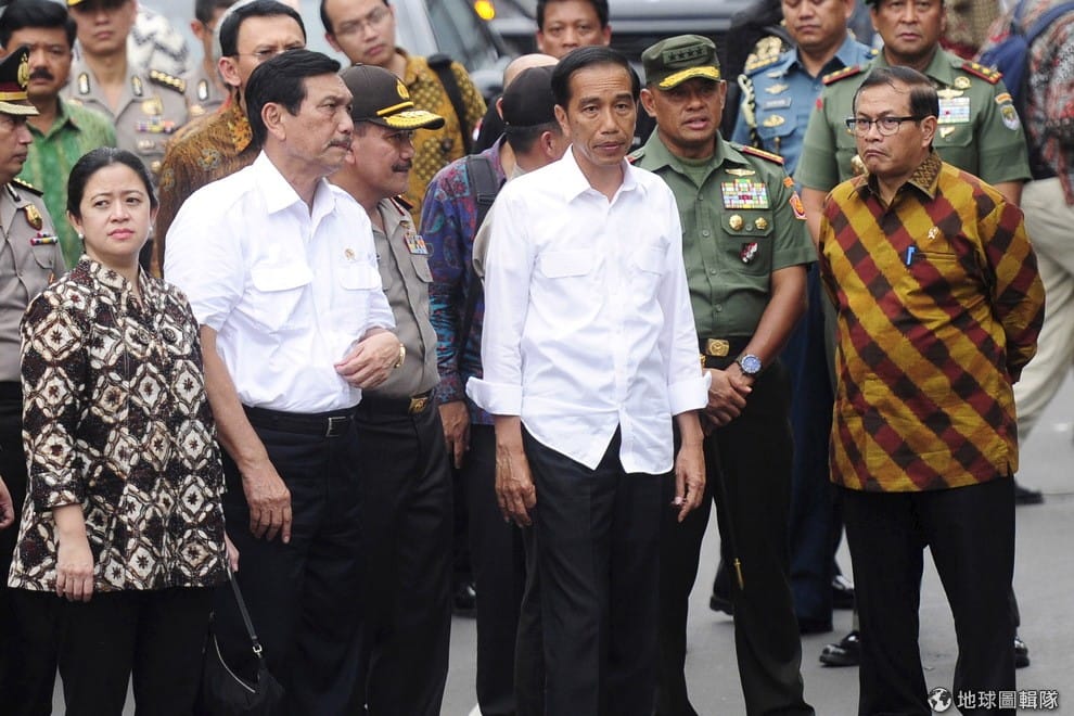 印尼總統佐科威(前排左三)譴責恐攻,表示這次的事件很明顯是故意要擾亂社會安寧,並製造大眾恐慌。