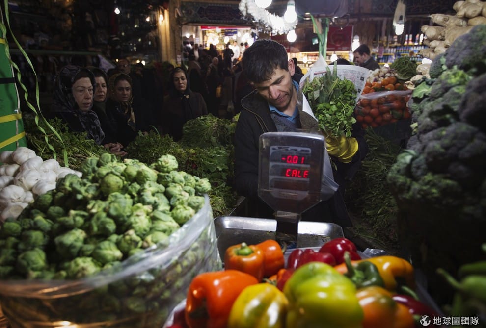 一名伊朗小販正在為客人算蔬菜的價錢。伊朗現在面臨了通膨跟高失業率等經濟問題。