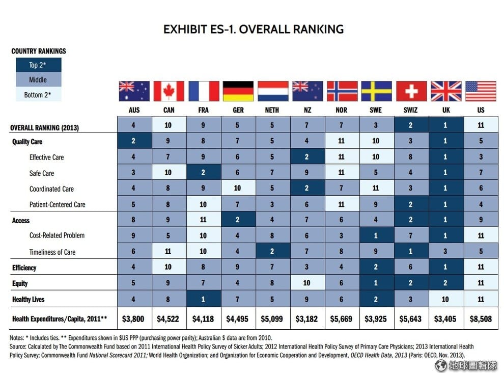 圖為美國commonwealthfund最新調查,當中可以見到英國的醫療照護在十一個國家中排名第一。