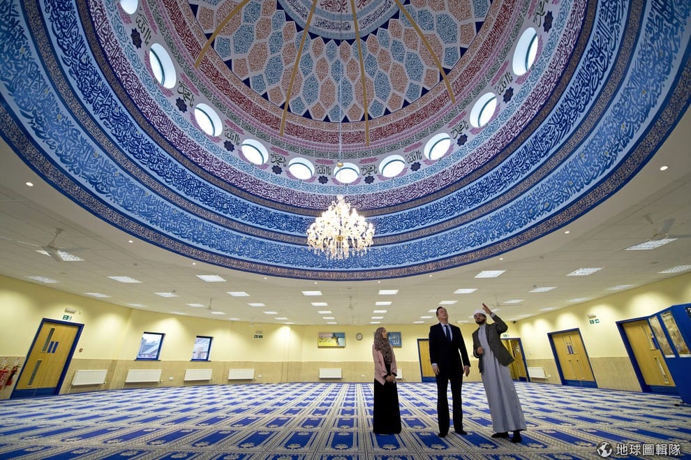 英國首相卡麥隆(中)在伊瑪目阿西姆(右)和致力於穆斯林婦女權利的律師孟尼爾的陪伴下,參觀位於里茲的清真寺。