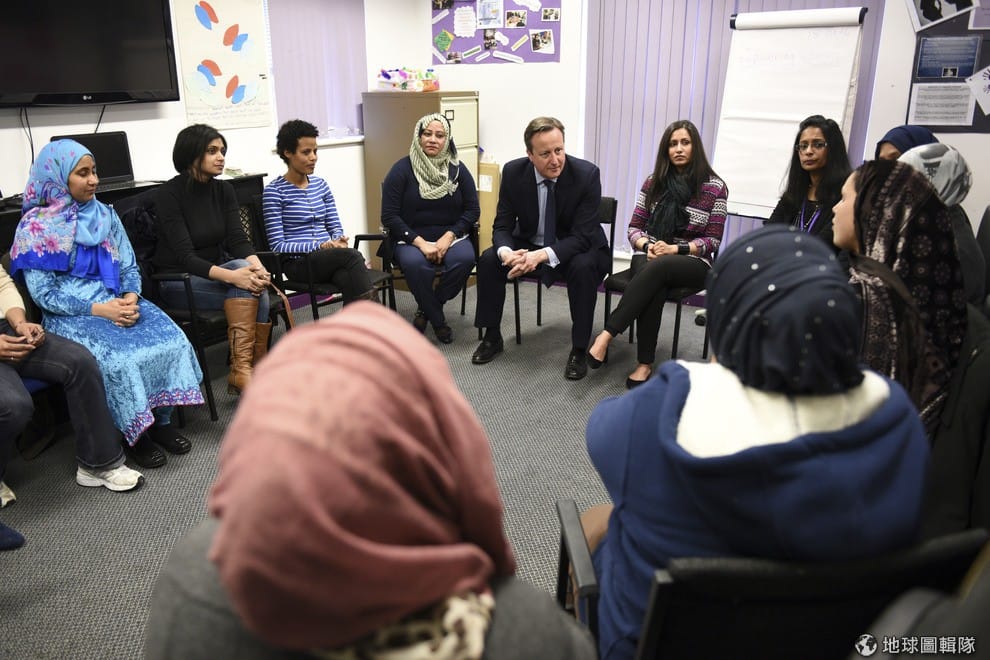 英國首相卡麥隆(中)來到專門為穆斯林婦女開設英文課的桑塔納婦女中心,了解穆斯林婦女學英文的狀況。