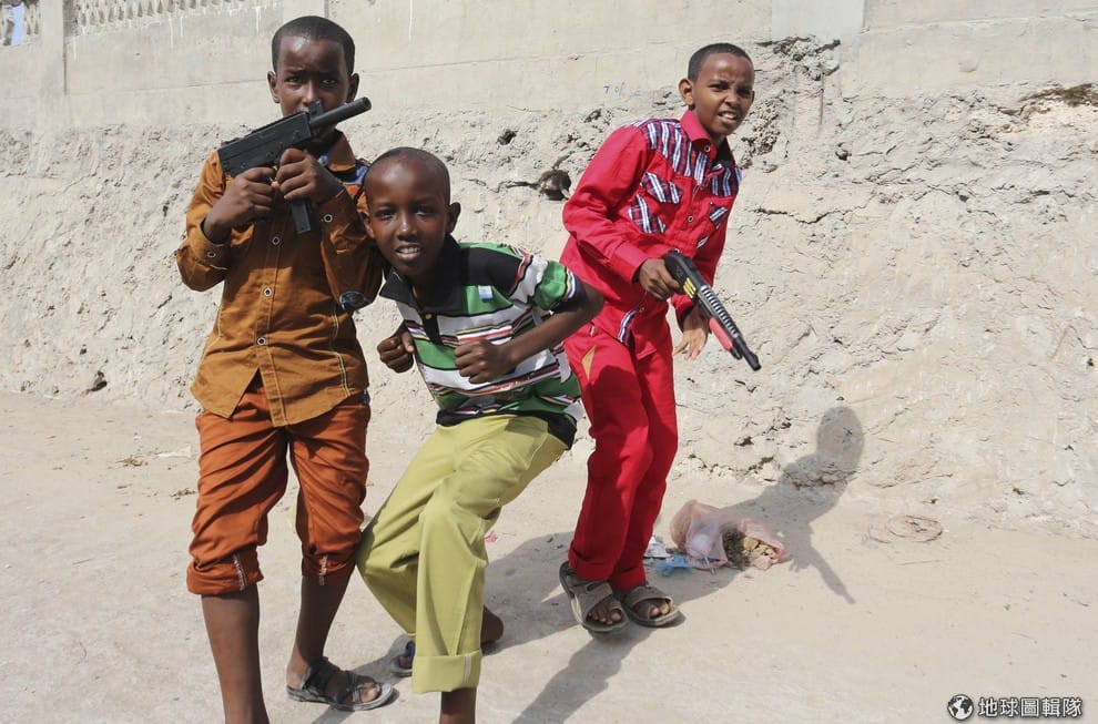 索馬利亞小孩拿著玩具槍擺出帥氣的姿勢。