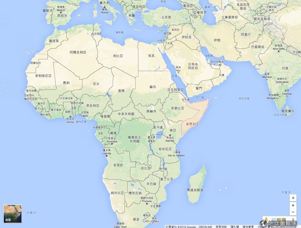 上圖的紅色區域是東非國家索馬利亞,根據《維基百科》,索國目前仍處於內戰狀態,儘管 2012年時成立了臨時政府,但國內仍有眾多勢力,加上伊斯蘭激進組織持續活動,造成內戰不斷,教育和社會體系崩潰,海盜猖獗。