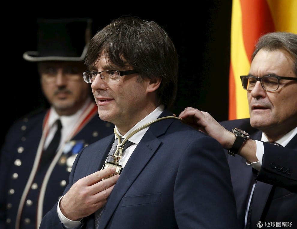 圖左為本月 12日被選為加泰隆尼亞自治區的領導人普伊格蒙特,前任領導人馬斯(右)在他的就職典禮上為他戴上獎章。
