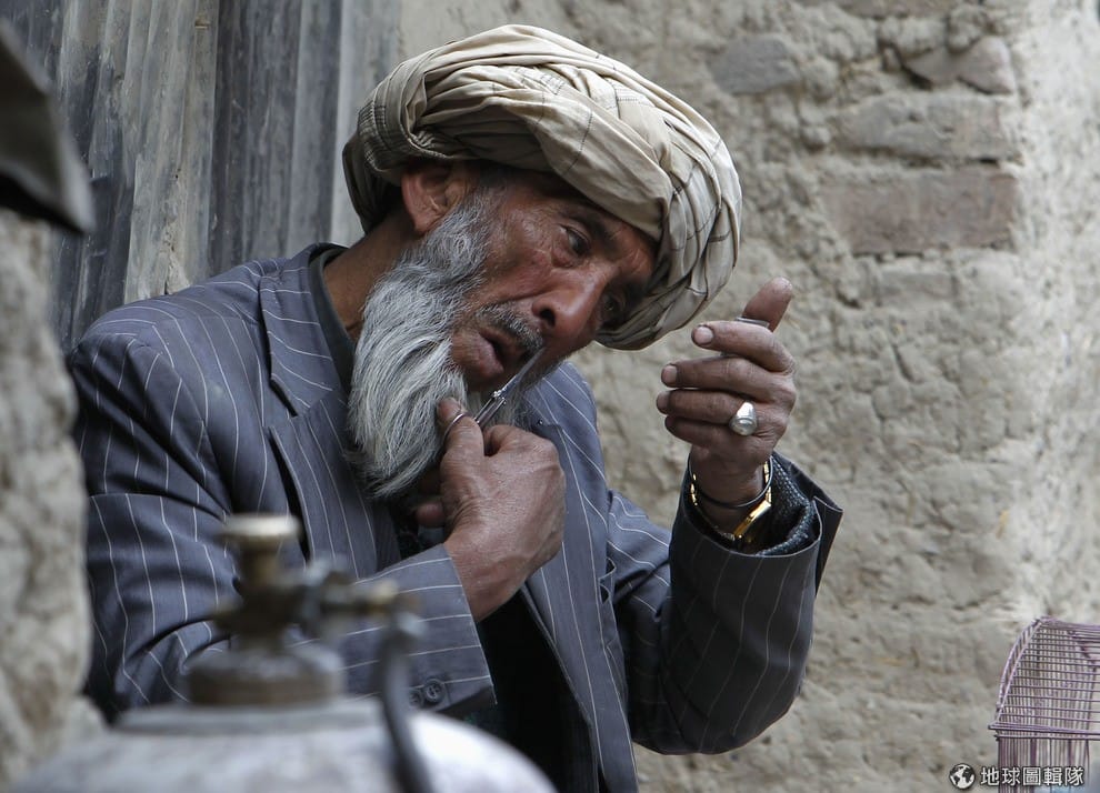 一名阿富汗男人正在修剪嘴唇上的鬍子。
