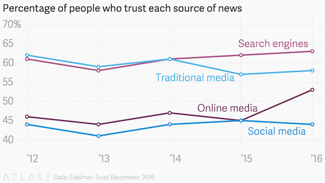 合作夥伴國際公關公司愛德曼(Edelman)所做的這項研究,針對來自全球 28 個國家的 3.3 萬名受訪者做調查,調查結果顯示,高達 63% 的受訪者表示,他們較信賴 Google 這類搜尋引擎所提供的新聞及訊息;而信賴網路新聞網站的數字雖較 2015 年大幅成長,但仍低於 Google 搜尋引擎、為 53%;信賴傳統新聞媒體的則為 58%;信賴社群媒體平台所提供的新聞資訊比例為 44%。