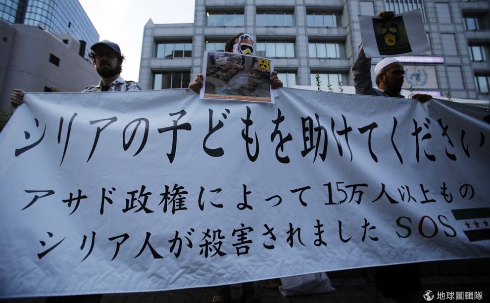 2013年的東京,敘利亞人與支持他們的團體舉著布條,請日本幫助敘利亞。