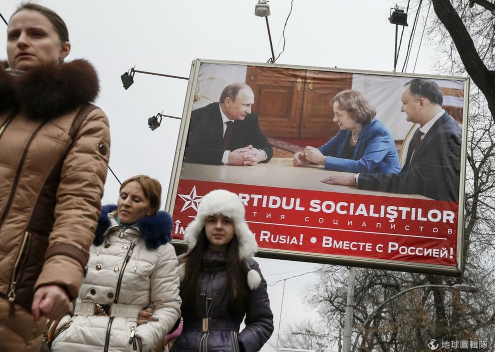 民眾走過俄國總統普亭(左)和摩爾多瓦社會主義黨人士會面的海報。過去,摩爾多瓦是蘇聯的一員,目前國內仍大分為親俄和親歐兩派。