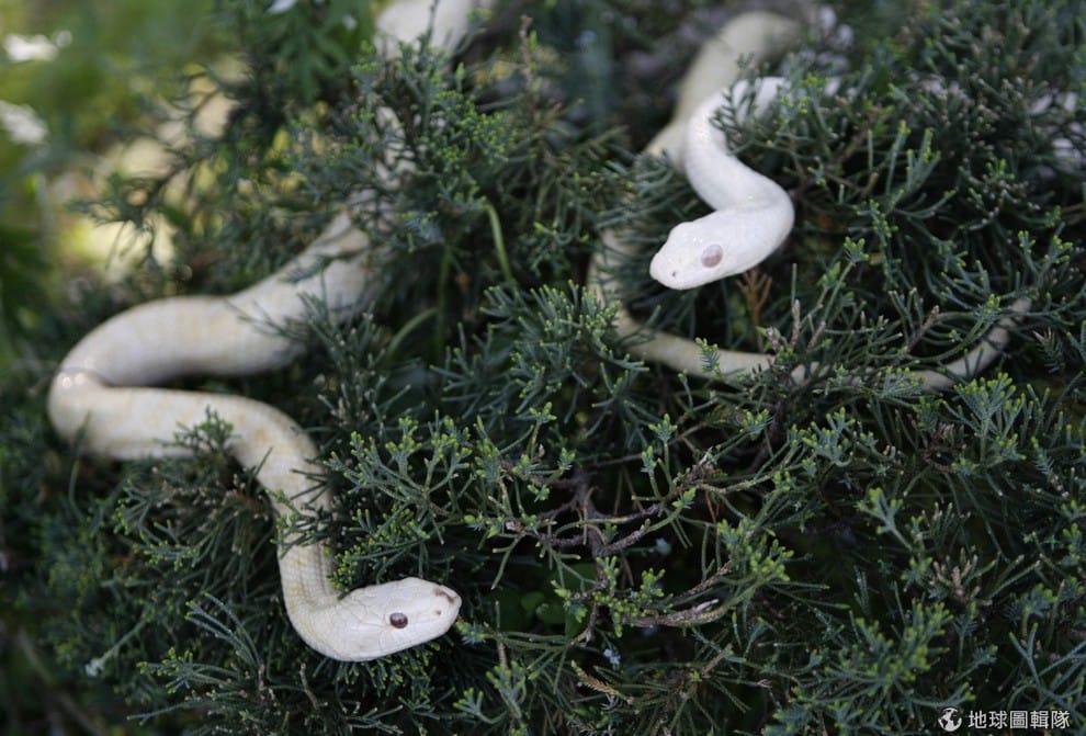 路透社日本岩國市當地,兩隻白色的錦蛇從樹叢中探出頭。