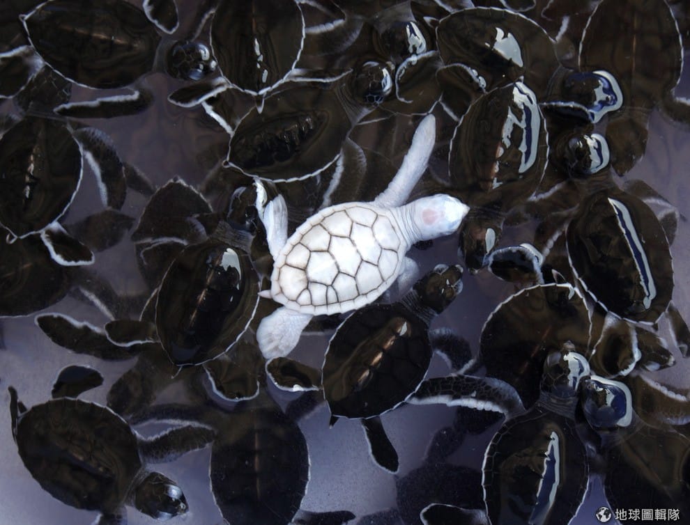 網友Liam Quinn泰國芭達雅鄰近的格克蘭艾島上,一隻白色的綠蠵龜跟著其他同伴在水池中優游。