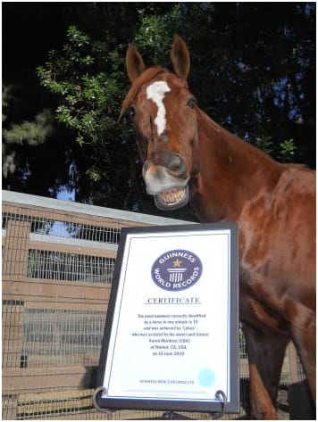 被金氏世界紀錄(Guinness Book of Records)稱為「世界上最聰明的馬(the smartest horse in the world)」的盧卡斯(Lukas),原先是賽馬,但在賽 馬場的表現並不好,所幸遇到牠的「伯樂」----卡倫莫達(Karen Murdock)女士,啟發了牠的潛能,可以辨識顏色和形狀。