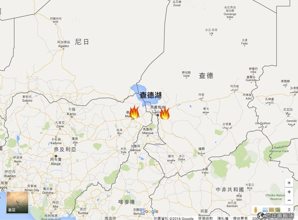 圖中兩點是 30號相繼傳出恐攻的地點,左邊是奈及利亞的達洛里,右邊是查德共和國首都恩賈梅納,距離此處不遠的兩個村落在同一天內受到攻擊。