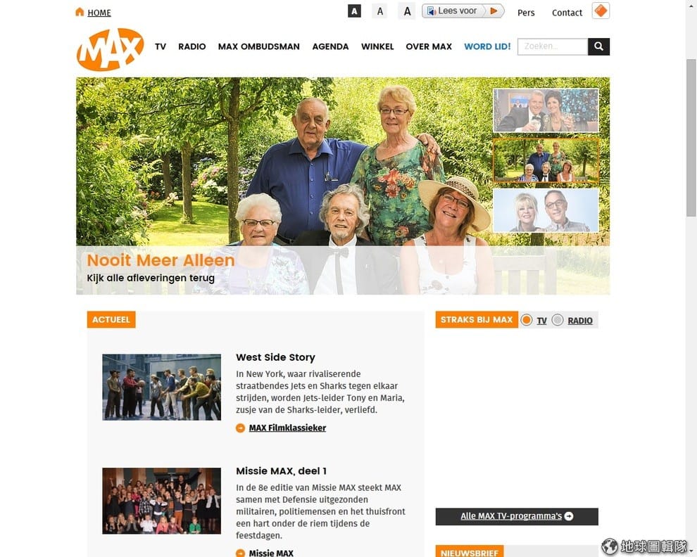 荷蘭MAX電視台的網站,可以見到針對熟齡族群的節目內容。