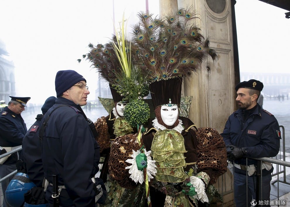 為期 2個禮拜的威尼斯嘉年華盛大展開,不過警察要求所有到威尼斯聖馬可廣場欣賞「天使飛行秀」(Flight of the Angel show)的人都要先摘下面具安檢,並讓警察用金屬探測棒掃過行李,才能入場享受嘉年華。