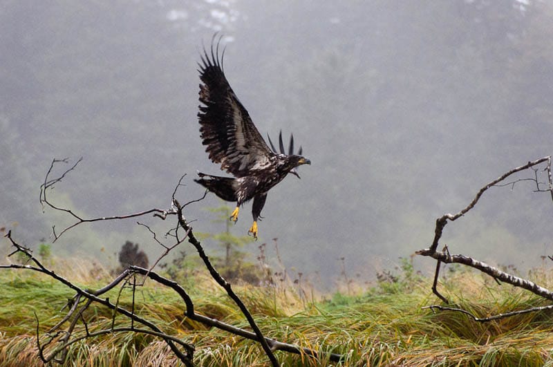 雨林裡,一隻白頭海鵰(bald eagle)從枝頭上起飛。