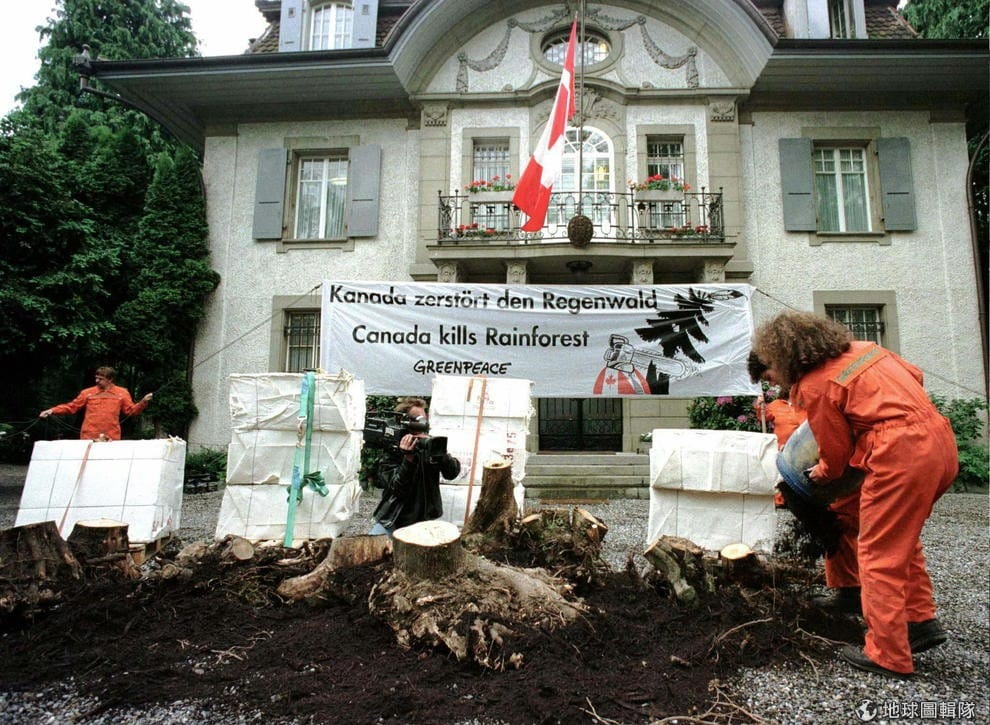 經過數十年的抗議、協商才達成今天的保護雨林協議,圖為綠色和平組織在 1997年的時候到加拿大駐瑞士大使館抗議,要求保護大熊雨林。