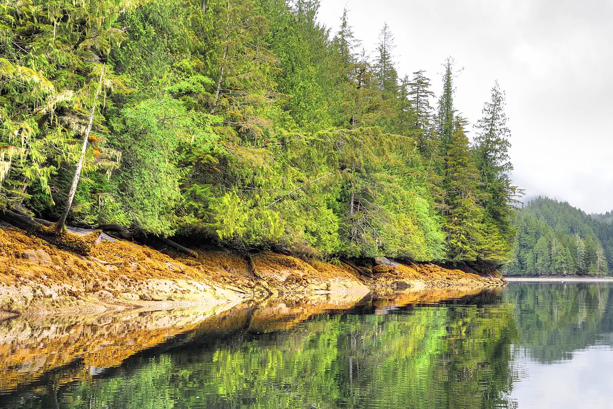 大熊雨林從加拿大西北的瓜達拉島(Quadra Island)一路延伸到阿拉斯加,面積足足有 640萬公頃(約 1.7個台灣大)。雨林生物多樣性豐富,長有千年歷史的美西紅側柏(western red cedar)、高約 30層樓的錫特卡雲杉(Sitka spruce),住著水貂、白色柯莫德熊以及通稱為「第一民族」(註1)的加拿大 26個原住民民族。