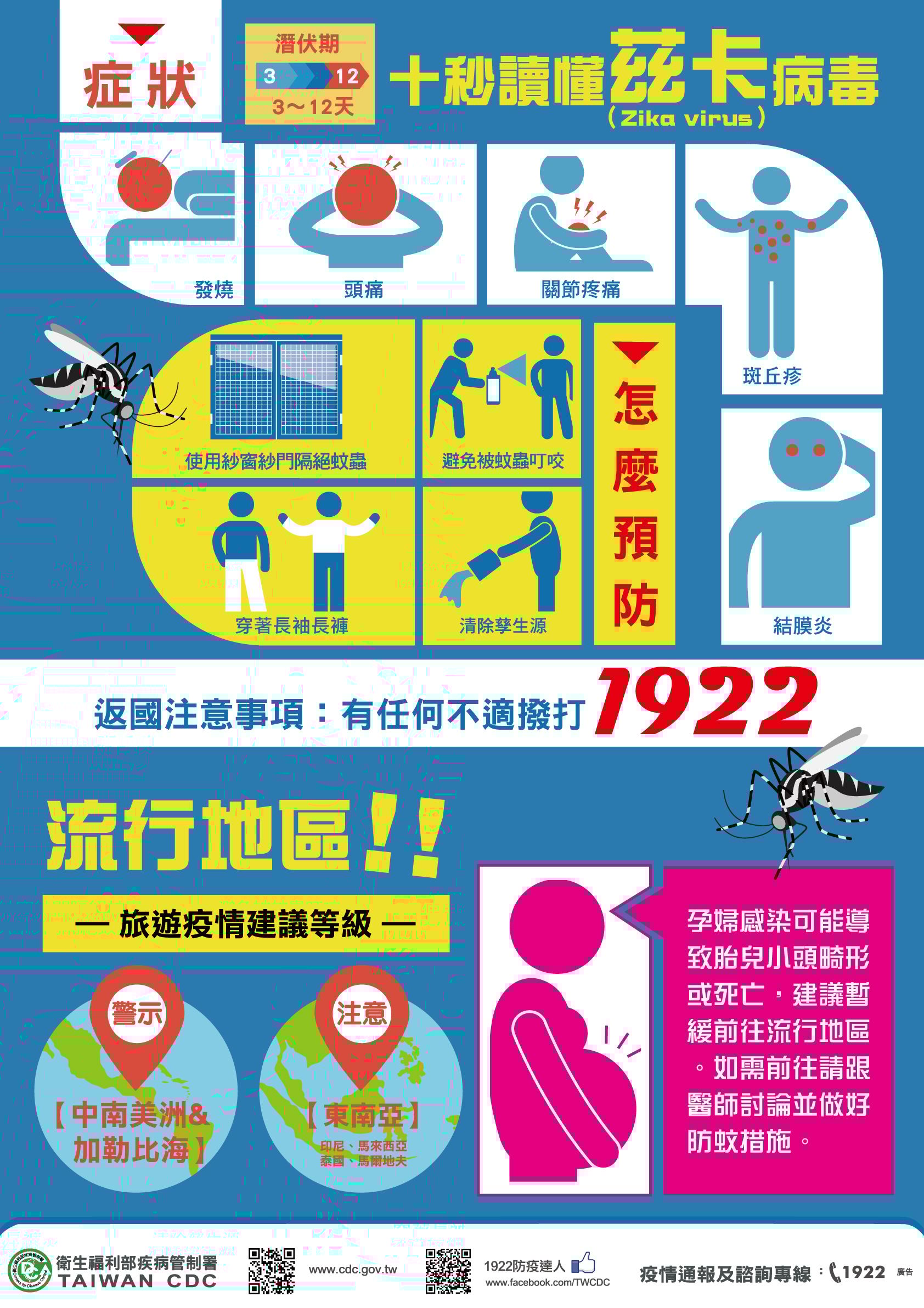 路透社疾管署發布有關茲卡病毒的資訊,提醒民眾防治病媒蚊,同時暫時避免前往中南美洲、加勒比海和東南亞等疫區。