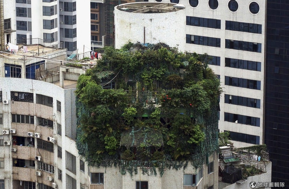 廣州一棟樓高 19層的大廈上,被綠色植物包裹的樓層吸引大家的注意。這間綠意盎然的房舍是加蓋在樓頂的違章建築,十多年前就已經蓋好,當局多次想拆但都因找不到房舍的主人而作罷,現在反而成了當地一景。