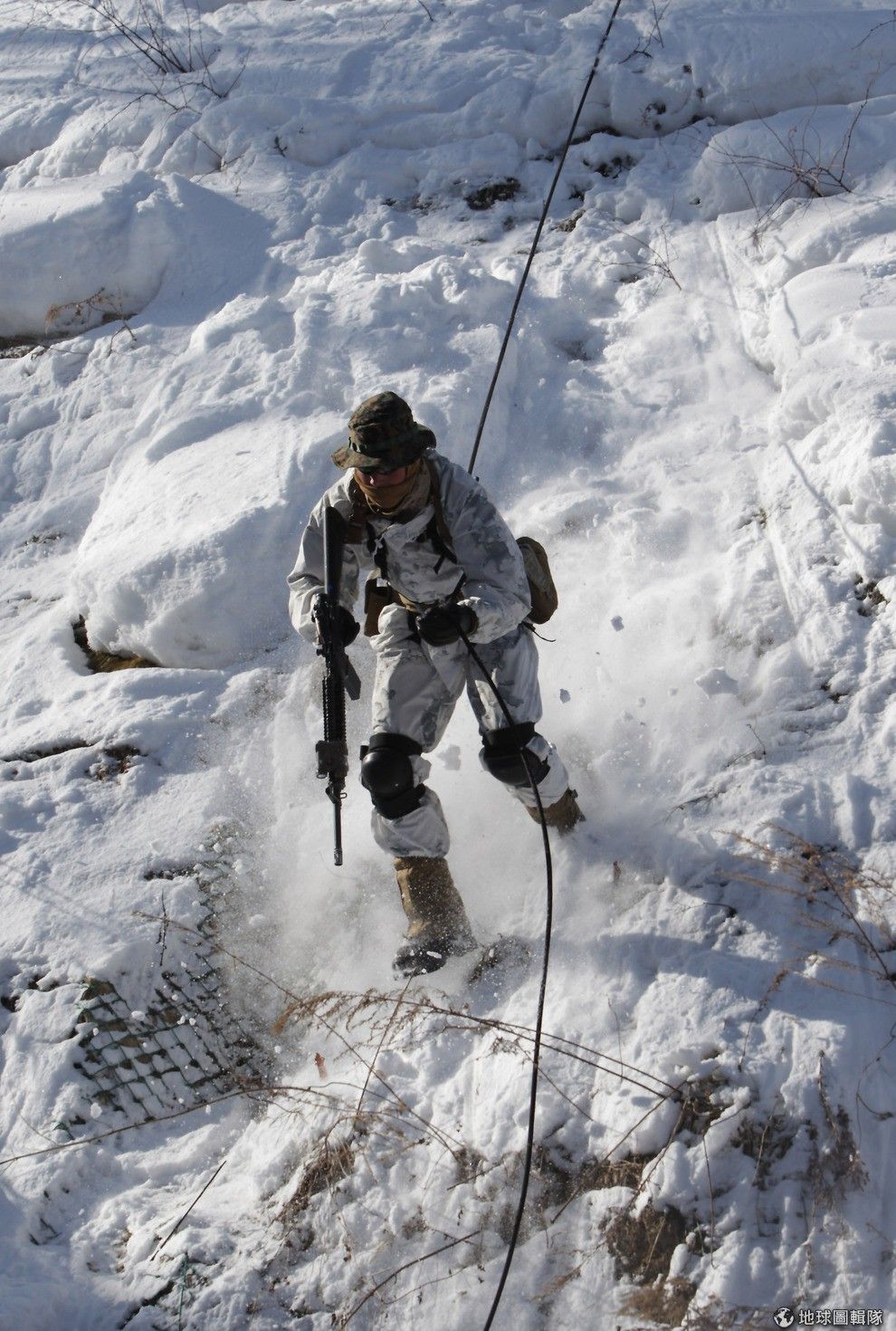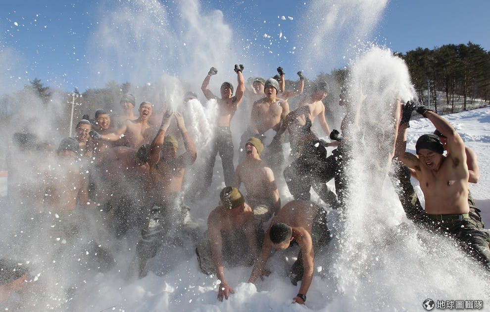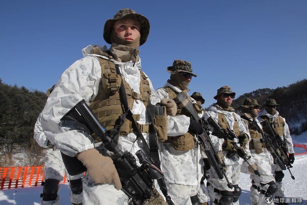 gettyimages2012年底,北韓軍事動作頻頻、還不斷放話威脅下,不服氣的南韓也首次和美軍合作冬季訓練;來自夏威夷的美軍陸戰隊、和南韓陸戰隊一起在「平昌」(Pyeongchang)進行冬季訓練,攝氏20度C下低溫中,他們要忍受刺骨的酷寒,進行高山滑雪、射擊、爆炸等等訓練。訓練期間,軍人的表情大多肅穆認真,但一來到「騎馬打仗」時,他們也露出少見的笑臉!