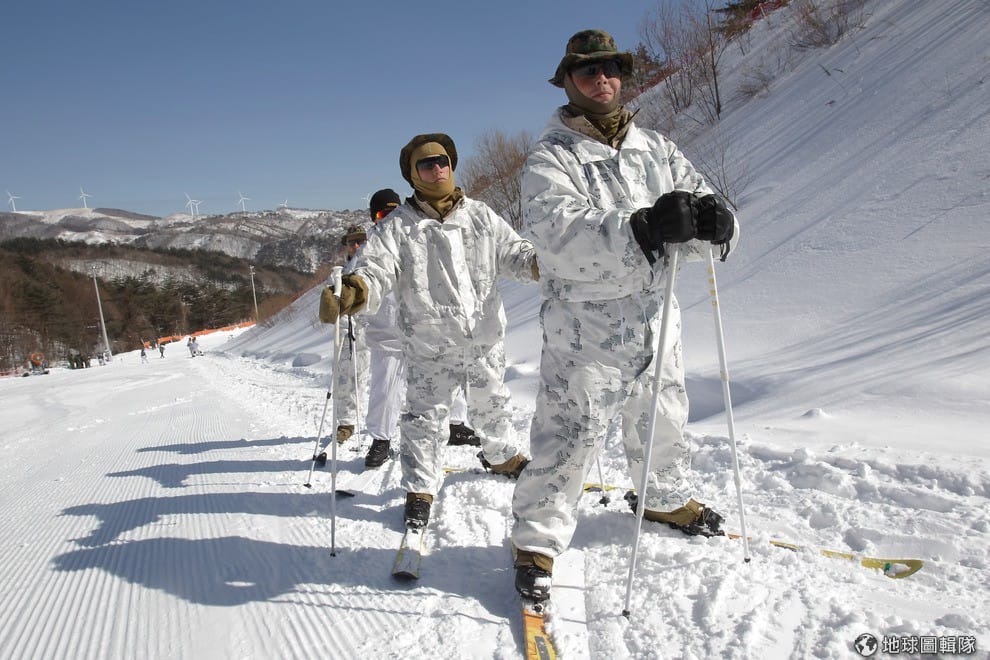 來自夏威夷的美軍和南韓軍人,在平昌進行冬季訓練。官方稱要利用這次的訓練讓美方軍隊也能熟悉山勢地形。Chung Sung-Jun/Getty Images
