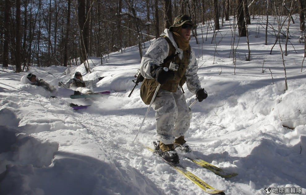 gettyimages軍人們要手持放出煙幕的槍,邊穩定滑雪前進。Chung Sung-Jun/Getty Images