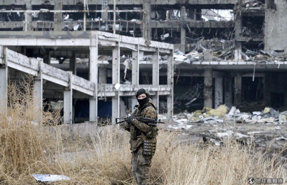 一名親俄的頓內次克人民軍站在廢墟前留影,他的身後是受到戰火波及的建築物。烏克蘭總統波洛申科表示,俄軍並沒有遵守明斯克協議,仍對當地造成威脅。
