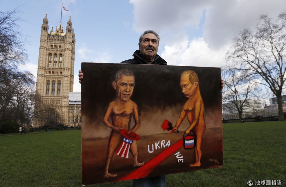 一名英國插畫家對著鏡頭展示他的作品,圖中美國總統歐巴馬(左)和俄國總統普亭(右)因為烏克蘭問題陷入衝突。