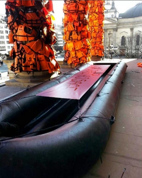 在救生衣柱底下,中國藝術家艾未未擺上了一艘橡皮艇,難民們就是搭著這種橡皮艇冒險橫渡地中海到歐洲。