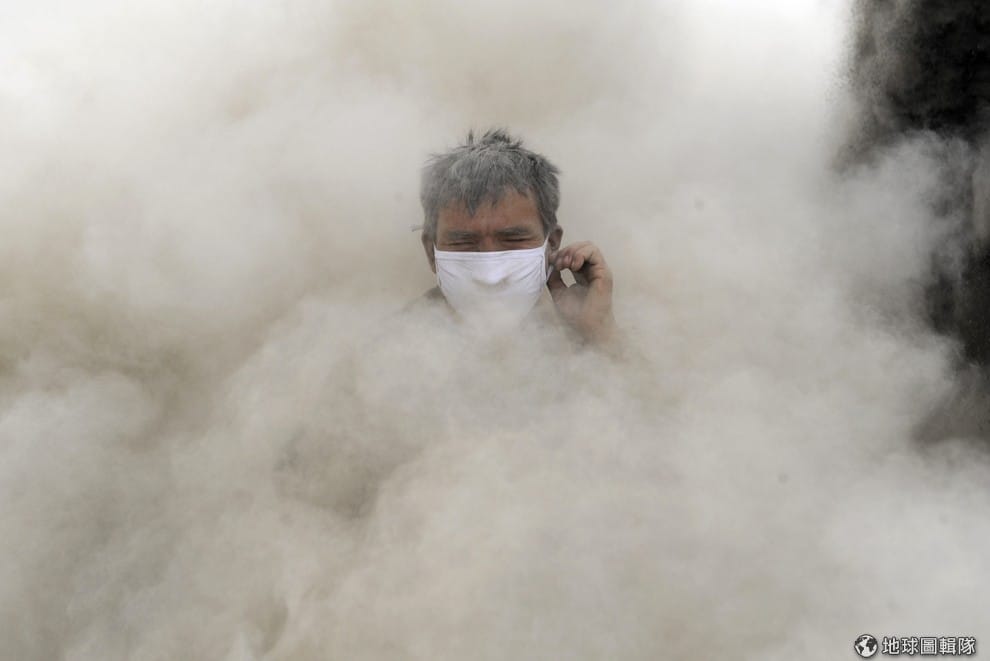 一名工人站在滿是粉塵的工廠內望著攝影師。