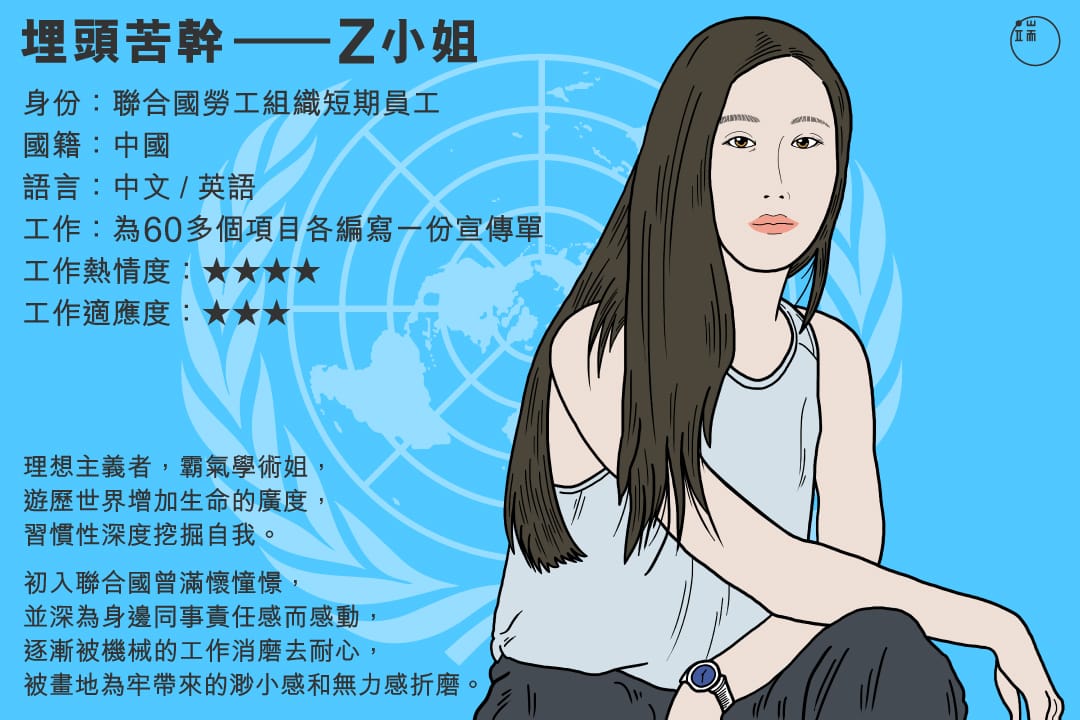 進入聯合國系統後方知其險阻,為削減開支而採用的臨時合同短的不可思議(有時按天結算,有同事曾拿到過兩週的合同)且不可確定,作為非歐洲公民的Z小姐一刻也不能失去工作,否則必須立刻打道回府。這樣的狀態,讓無業者瘋狂奔走,讓暫時有工作者朝不保夕,白天工作,晚上找下一步出路。能否獲得下一份合同與個人表現關係甚微,主要取決於所在部門是否有預算。於是工間與同事喝咖啡社交不僅是寒暄的解悶,而成為一次次非正式的內部求職。