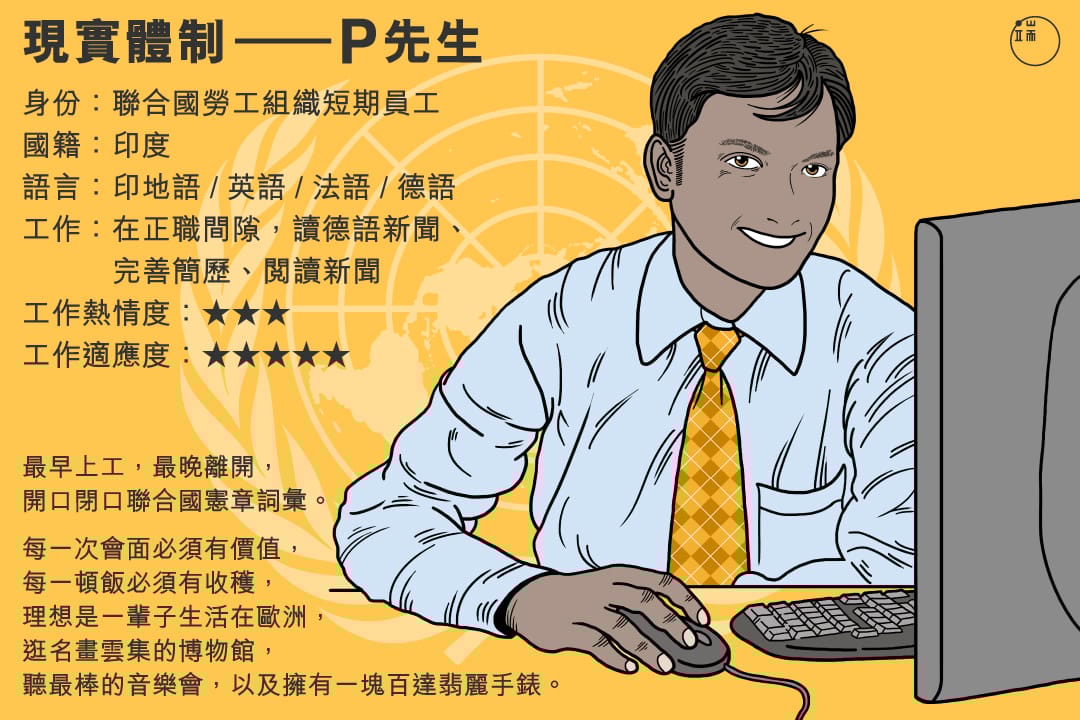 認識P君的同事們都叫他「體制哥 」(Mr Institution),因為他開口講話時,總是滿口聯合國憲章和只有在聯合國內部公文才會用到的官方詞彙。
