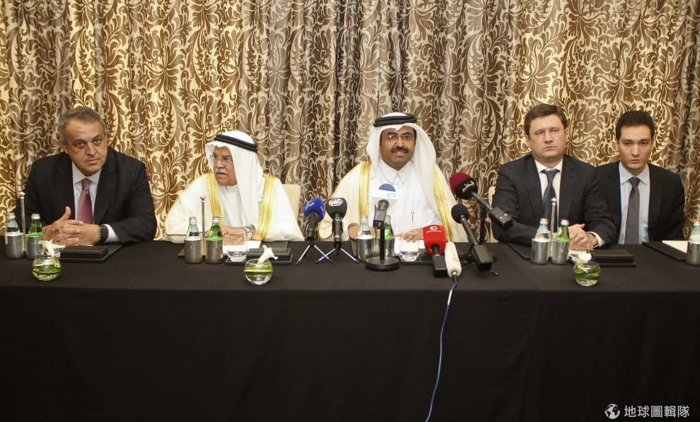 4個石油國的能源部長開會後,在記者會上發表結論,照片由左至右分別是委內瑞拉能源部長皮諾(Eulogio del Pino)、沙烏地阿拉伯能源部長努艾米(Ali al-Naimi)、卡達能源部長艾沙達(Mohammad bin Saleh al-Sada)、俄國能源部長諾瓦克(Alexander Novak)。