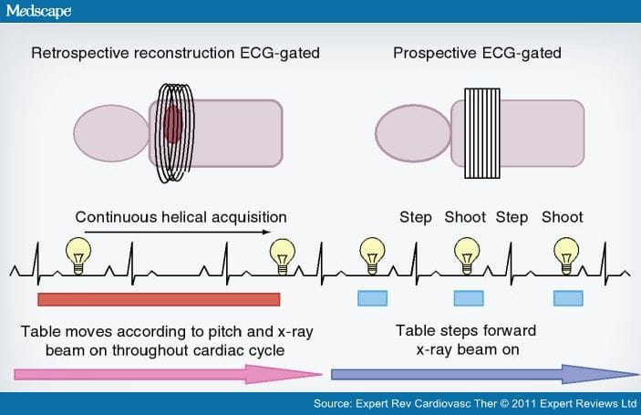 當然,最關鍵的是心臟區,要讓會跳動的心臟,呈現出完整而不模糊的影像十分艱難,團隊採用心電圖同步擷取模式(Prospective EKG triggering)電腦斷層照射法,也就是避開心臟收縮時期,選擇性在心臟舒張靜止時,以軸狀法(axial)掃描,再將影像重組,以得到清晰的影像,而且拍攝是間斷且不連續的(step and shoot),降低了輻射暴露劑量。