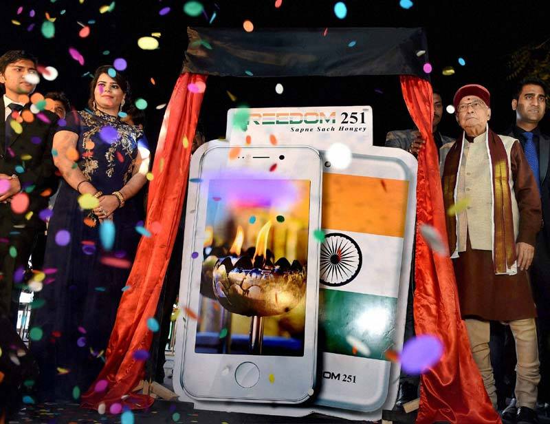印度手機公司Ringing Bells在發表會上,向媒體介紹全球最便宜的手機Freedom 251。
